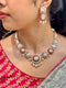 Details . Base Material: Pure Brass Plating: Carat Stone: Moissanite Polkis, Imitation Stones Finish: Embellished Hand Meenakari Cheed Pearls In the Box: Necklace with Thread, Earring Pair, Extra Push Size And Fit Necklace Earrings Weight: 64.4 g Length: 14 cm Without Thread Width: 5.5 cm Weight: 25.2 g Length: 6...
